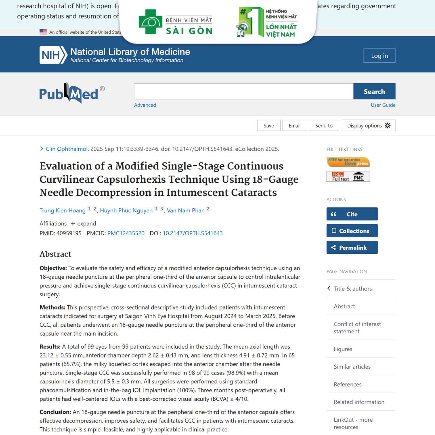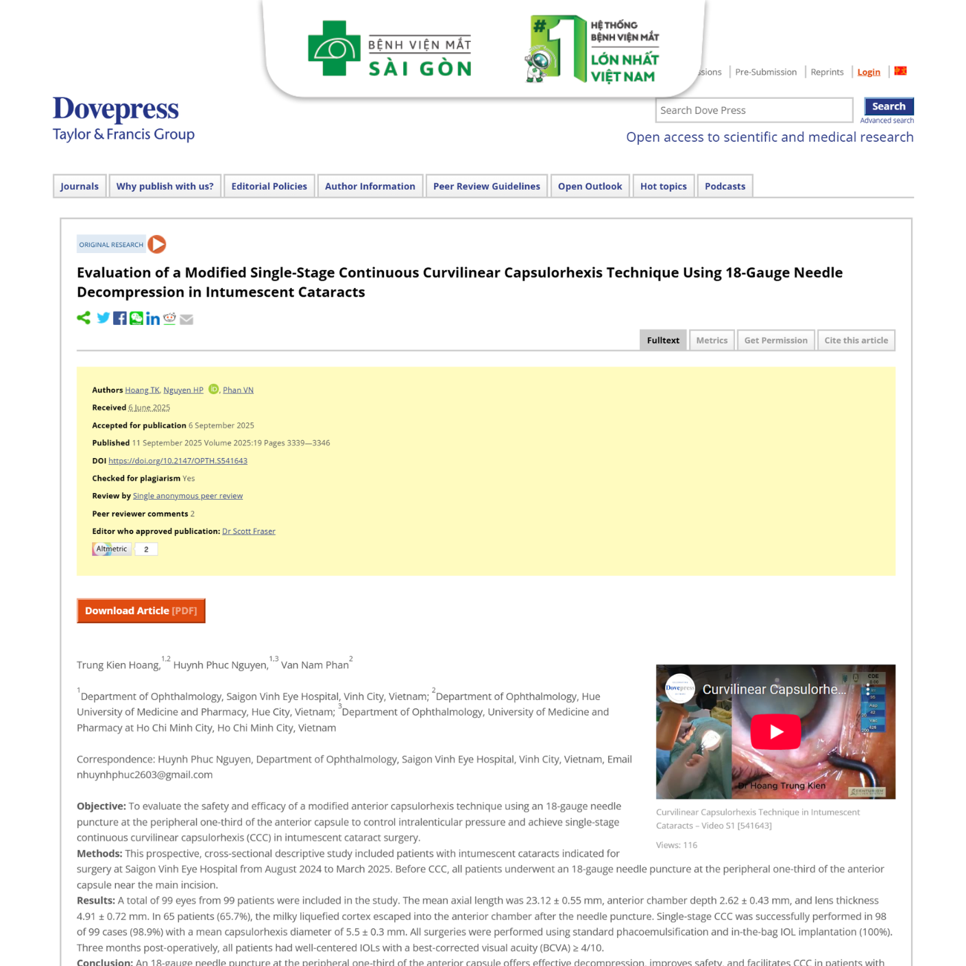 Thành tựu nghiên cứu khoa học nổi bật của Bác sĩ CKII Hoàng Trung Kiên cùng các cộng sự là bài nghiên cứu “Đánh giá kết quả kỹ thuật xé bao trước kết hợp chọc kim 18G vị trí 1/3 ngoài bao trong phẫu thuật đục thủy tinh thể chín trắng căng phồng” (Tên tiếng Anh: “Evaluation of a Modified Single-Stage Continuous Curvilinear Capsulorhexis Technique Using 18-Gauge Needle Decompression in Intumescent Cataracts”) vừa được đăng tải trên tạp chí y khoa danh tiếng Clinical Ophthalmology.